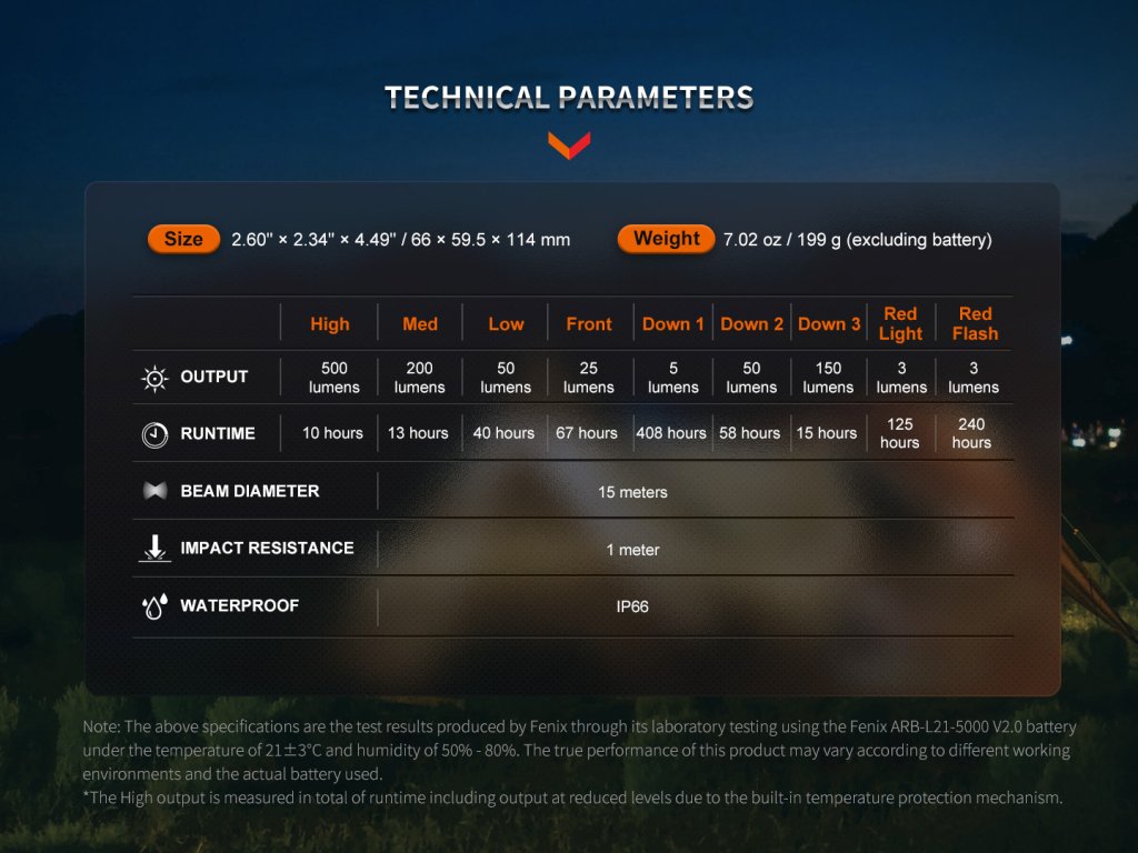 Kruhové svícení: 500 lumenů (10 hodin), 200 lumenů (13 hodin), 50 lumenů (40 hodin), stejnosměrné svícení 25 lumenů (67 hodin), červené světlo 3 lumeny (125 hodin), červené blikání 3 lumeny (240 hodin)