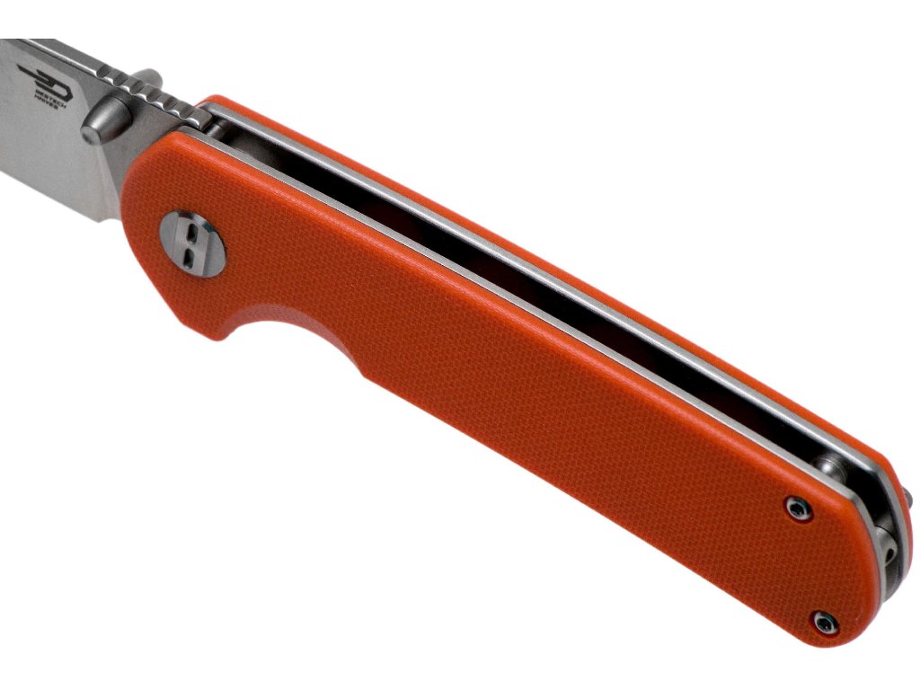 Rukojeť nože je vyrobena z oranžové G10, materiálu, který je známý pro svou odolnost a nízkou hmotnost. Texturovaný povrch rukojeti zajišťuje pevný a bezpečný úchop, což zvyšuje kontrolu nad nožem během jeho používání. Oranžová barva dodává noži estetický vzhled a zvyšuje jeho viditelnost, což je praktické při outdoorových aktivitách.