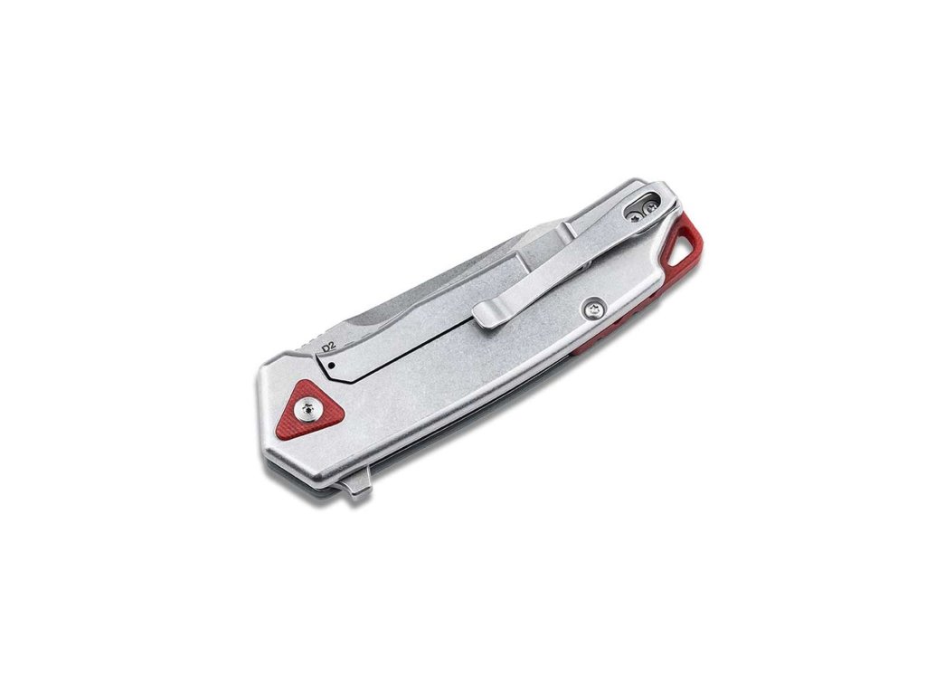 Design nože je doplněn červeným backspacerem s integrovaným otvorem pro šňůrku, který přidává barevný akcent. Trojúhelníkové prvky z G10 na zadní straně rukojeti dokonale zrcadlí strukturu přední části rukojeti, čímž noži dodávají vyvážený a stylový vzhled. Nůž je vybaven hlubokým kapesním klipem (tip-up/r), který umožňuje diskrétní nošení.