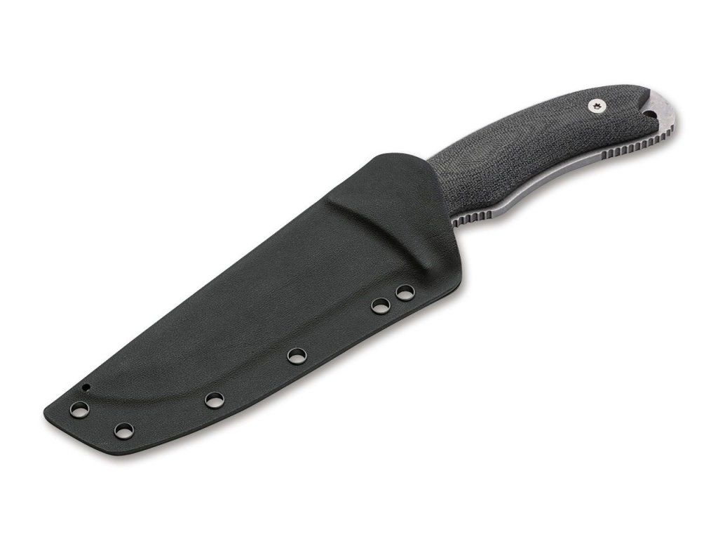 Nůž je vybaven vroubkováním na konci rukojeti, které je tvarováno jako úderná část, a také v oblasti opěrky palce, což ještě více zvyšuje bezpečnost při práci. Nůž má otvor na šňůrku a dodává se s přesně tvarovaným Kydex pouzdrem a adaptérem na opasek pro pohodlné nošení.