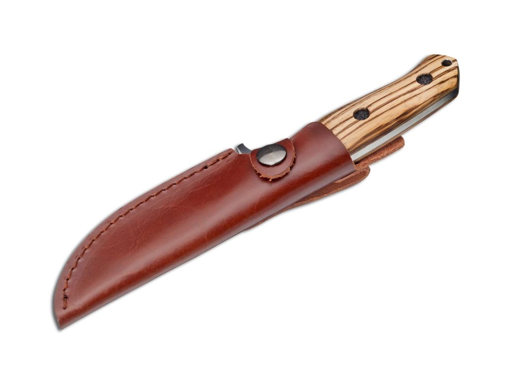 Magnum Zebra Drop je nádherně tvarovaný outdoorový nůž, který zaujme svou rukojetí z ručně vybíraného zebra dřeva. Krásná kresba tohoto odolného dřeva je zvýrazněna hlubokými hnědými liniemi, což dodává noži přírodní a luxusní vzhled. Čepel z nerezavějící oceli 440A s mírně modifikovaným drop-point tvarem prochází celým nožem, od špičky až po konec rukojeti, čímž poskytuje vysokou stabilitu a odolnost. Výrazná záštita zajišťuje bezpečné používání nože i v náročných podmínkách. Nůž je vybaven dírkou na šňůrku a dodává se s kvalitním koženým pouzdrem s drukem na zapínání.