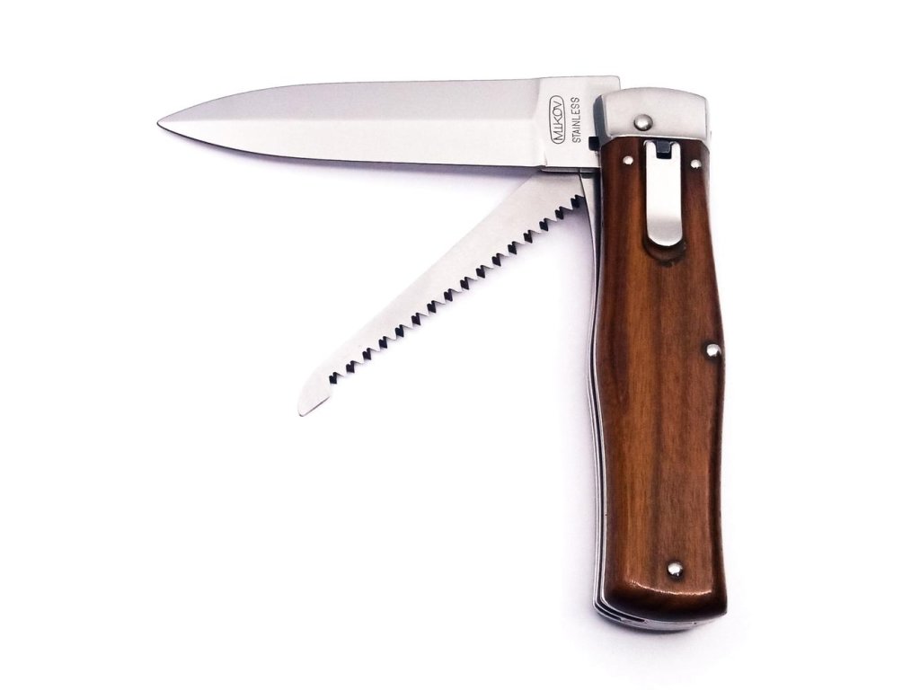 Mikov Predator Klasik 241-ND-2 je automatický zavírací nůž, známý také jako „vyskakovací nůž“, který kombinuje vysokou kvalitu a elegantní design. Tento nůž, vyrobený v Mikulášovicích v srdci Českého Švýcarska, disponuje rychlým a spolehlivým automatickým mechanismem, který umožňuje snadné otevření jednou rukou. Čepel je z kvalitní nerezové oceli 420 s tvrdostí 52–55 HRc a rukojeť z exotického dřeva Palisander Santos poskytuje pohodlný a pevný úchop.