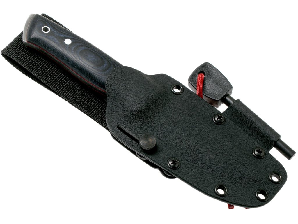 • Pevné pouzdro: Nůž je dodáván s odolným kydexovým pouzdrem, které obsahuje držák na magnéziový podpalovač pro rychlé a bezpečné připevnění.