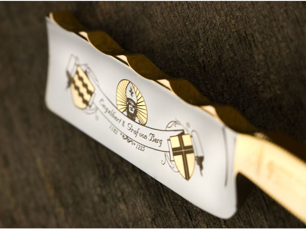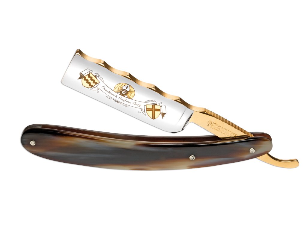 Posledný gróf von Berg, Engelbert II., bol tiež známy ako arcibiskup Kolína. Po jeho zavraždení prešlo Bergské kniežatstvo do Rodu Limburg. Táto nádherná britva s veľkosťou 7/8 palca zobrazuje Engelberta ako arcibiskupa Kolína. Stupňovitá hlava čepele (brúsená tak, aby vytvárala správny zvuk) vyrobená z najjemnej ocele na britvy zo Solingenu, spolu s zakriveným chrbtom čepele a rukoväťou z pravého parohu, vyjadrujú veľkú eleganciu a jedinečnú kvalitu.