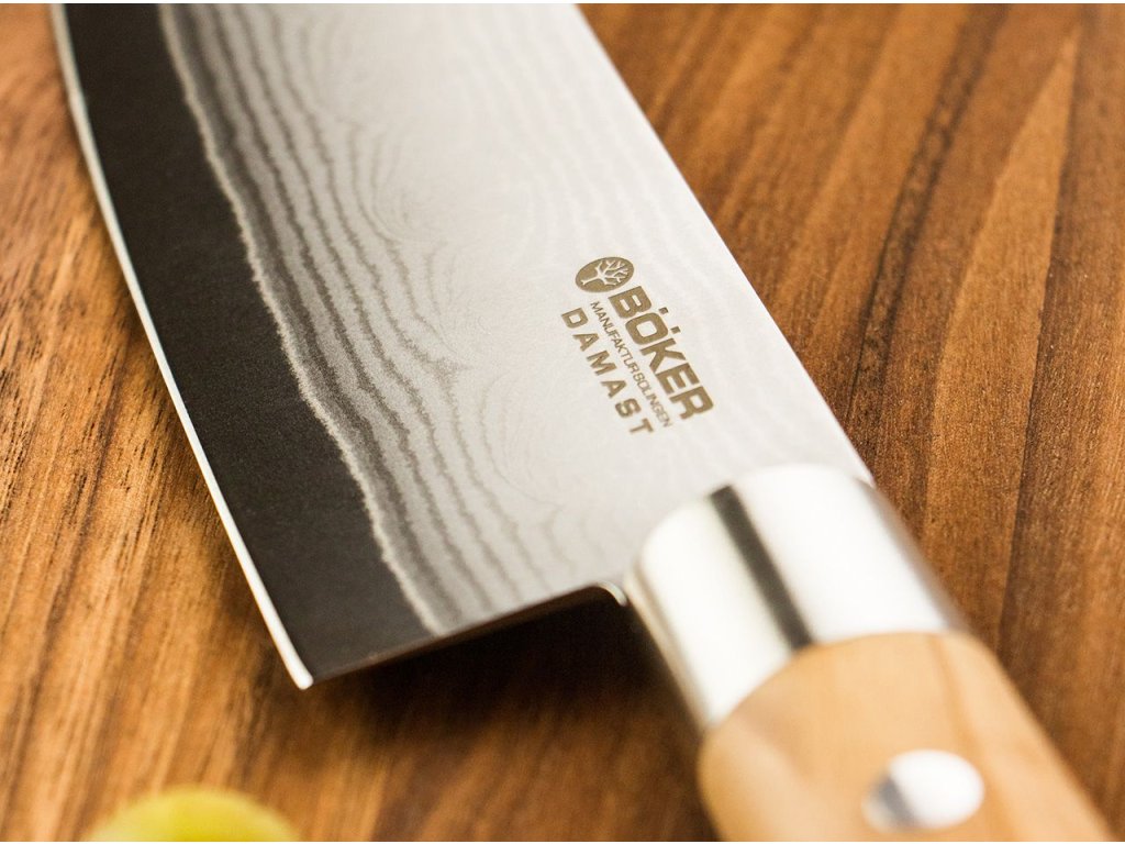 Séria kuchynských nožov Böker Damascus Olive kombinuje tradičné japonské rukoväte vyrobené z lokálneho olivového dreva s extrémne ostrými čepeľami z nehrdzavejúcej damascénskej ocele so 37 vrstvami, ktoré sa vyznačujú nádhernou štruktúrou. Jadro damascénskej čepele tvorí vysoko výkonná oceľ VG-10, ktorá poskytuje výnimočnú ostrosť pri krájaní a robí z varenia jedinečný zážitok. Japonský dizajn rukoväte s matovanými svorkami z nehrdzavejúcej ocele dodáva tejto sérii špeciálny charakter.