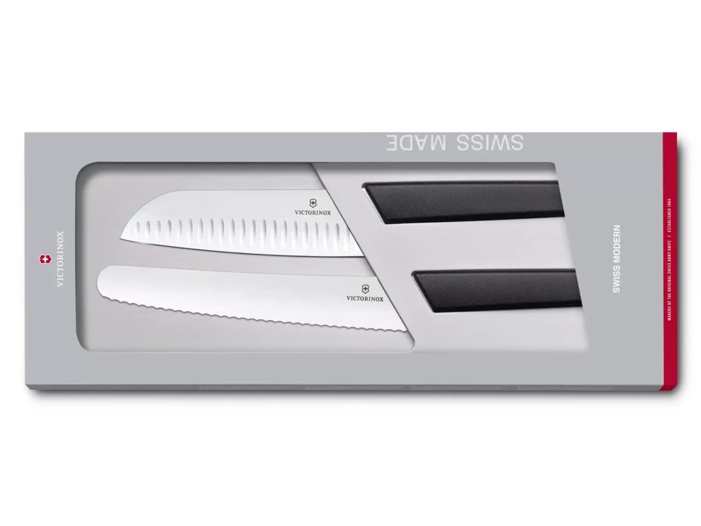 Victorinox Swiss Modern Kuchynská súprava 6.9093.22G je moderná 2-dielna sada navrhnutá pre pohodlné a efektívne spracovanie všetkých druhov surovín. Táto sada obsahuje Santoku nôž a nôž na pečivo a cukrovinky s trendovými syntetickými rukoväťami, ktoré nahrádzajú tradičné orechové drevo. Ergonomické a odolné rukoväte sa jednoducho udržiavajú a sú vhodné do umývačky riadu, čo robí túto súpravu ideálnym pomocníkom v každej kuchyni.