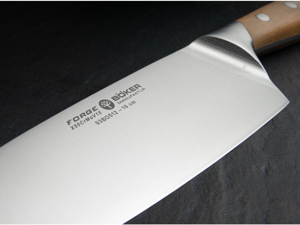 Kuchynský nôž Böker Forge Wood Santoku je prémiový japonský nôž s čepeľou z ocele X50CrMoV15 a rukoväťou z javorového dreva.