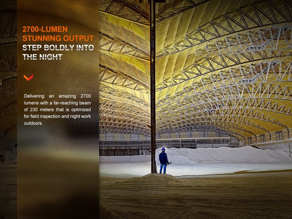 • LED: Luminus SFT-70 (diaľkový reflektor, 2700 lúmenov, 230 metrov dosvit) a Luminus SST-20 (široký reflektor, CRI 90, 500 lúmenov, 47 metrov dosvit).