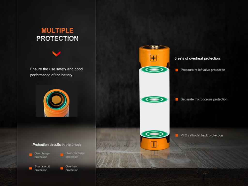 Fenix ARB-L14-1050 je vysoko kvalitná nabíjateľná Li-ion batéria veľkosti RCR123A (14500) s kapacitou 1050 mAh, ktorá je vybavená ochrannou elektronikou. Táto batéria využíva lítovo-iónovú technológiu, ktorá poskytuje jeden z najlepších pomerov uchovanej energie k váhe článku. Navyše, batéria nemá pamäťový efekt a samovybíjanie je minimálne.