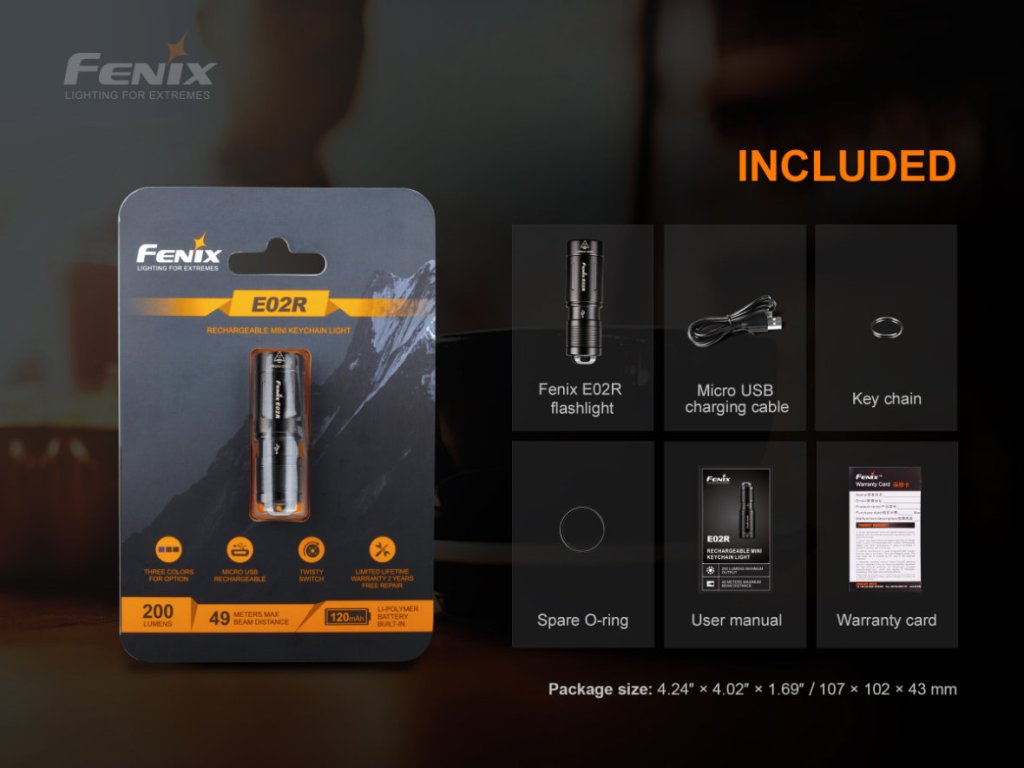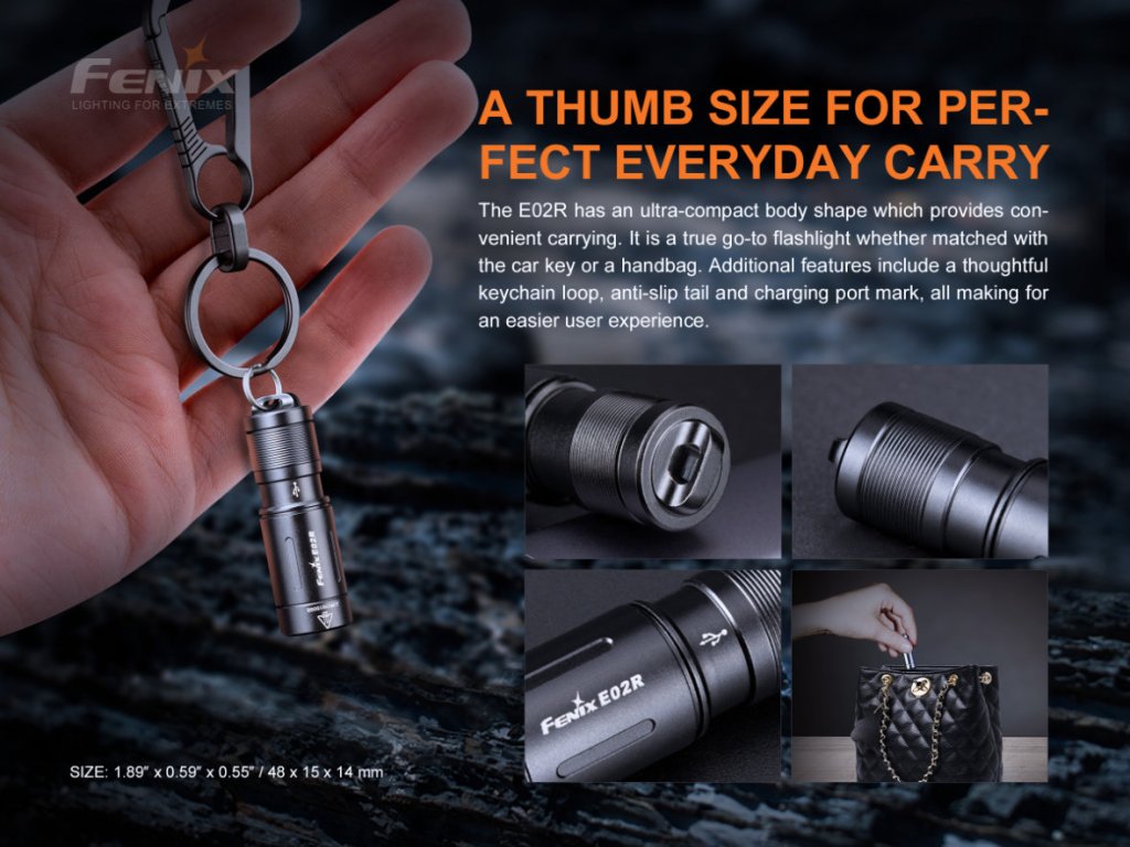 Predstavujeme vám Fenix E02R, kompaktné a vysoko výkonné svietidlo, ktoré môžete jednoducho pripevniť na kľúče alebo nosiť vo vrecku. Aj napriek svojim minimálnym rozmerom ponúka svetelný tok až 200 lúmenov a dosvit 49 metrov. Napájanie zabezpečuje Li-polymérový akumulátor, ktorý sa jednoducho nabíja cez micro-USB konektor, čo je súčasťou balenia. Je dostupná v troch farebných variantoch: čierna, modrá a hnedá.