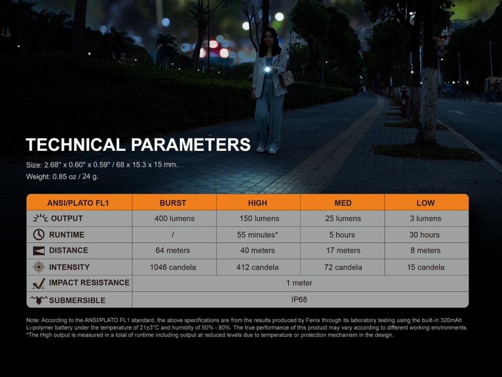 Napriek svojim kompaktným rozmerom, Fenix E05R prináša pôsobivý svetelný výkon až 400 lúmenov. S BURST režimom môžete dosiahnuť dosvit až 64 metrov, čo z tejto minibaterky robí ideálneho spoločníka pre každodenné nosenie. Navyše, so vstavaným Li-pol akumulátorom s kapacitou 320 mAh môžete svietiť až 30 hodín v najnižšom režime.