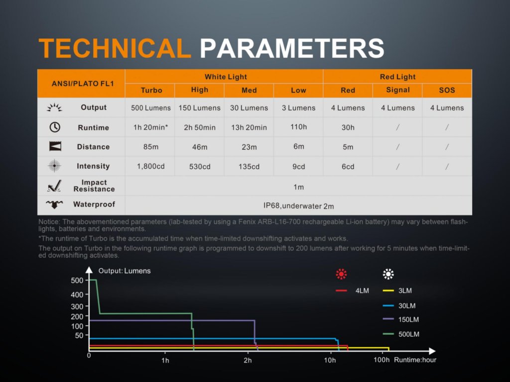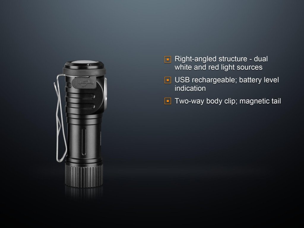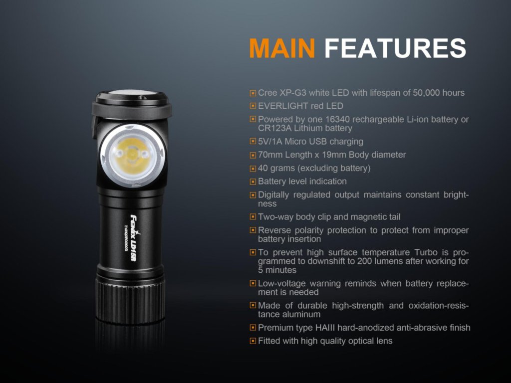 Fenix LD15R je výkonná nabíjateľná vrecková baterka, ktorá ponúka svetelný tok až 500 lúmenov (ANSI) neutrálneho bieleho svetla (4500 K) s dosvitom až 85 metrov a navyše je vybavená aj červenými LED. Napája ju jeden nabíjací akumulátor typu RCR123A, ktorý sa dobíja priamo vo svietidle cez micro-USB konektor, alternatívne je možné k napájaniu použiť aj jednorazovú lítiovú batériu CR123A. V ovládacom tlačidle je navyše indikačná LED, ktorá vám ukáže, kedy je potrebné dobiť akumulátor. Koncovka svietidla je magnetická, takže ju možno ľahko uchytiť na čokoľvek železné. Naviac je svietidlo vybavené obojsmernou multifunkčnou sponou.