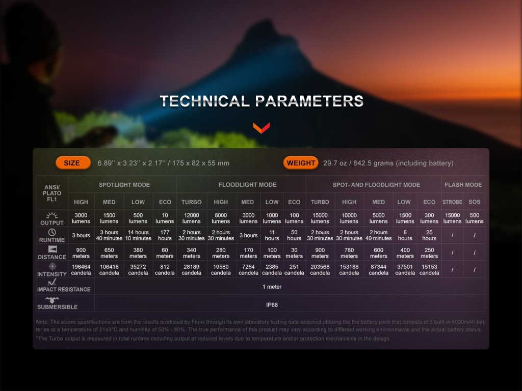 • Široký kužeľ: 12000 lm (2,5 hodiny) -> 8000 lm (2,5 hodiny) -> 3000 lm (3 hodiny) -> 1000 lm (11 hodín) -> 100 lm (50 hodín).