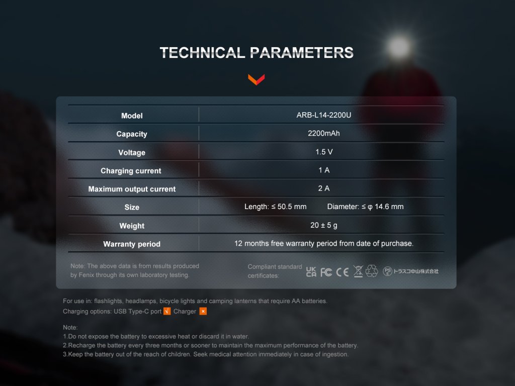 Fenix ARB-L14-2200U podľa dostupných informácií nahrádza bežné AA batérie, no vnútri používa Li-ion článok s riadiacou elektronikou. Tá drží stabilné napätie 1,5 V počas približne 70–80 % kapacity, čo je vhodné pre zariadenia citlivé na pokles napätia.