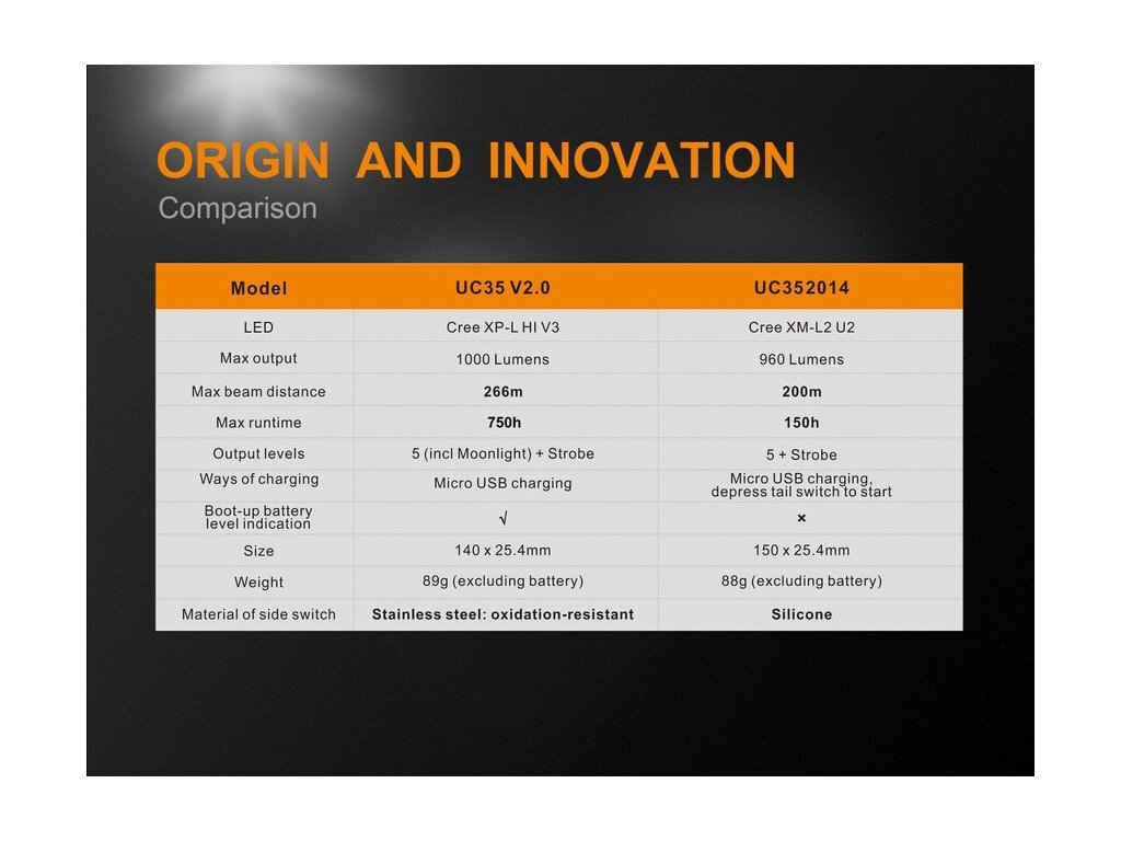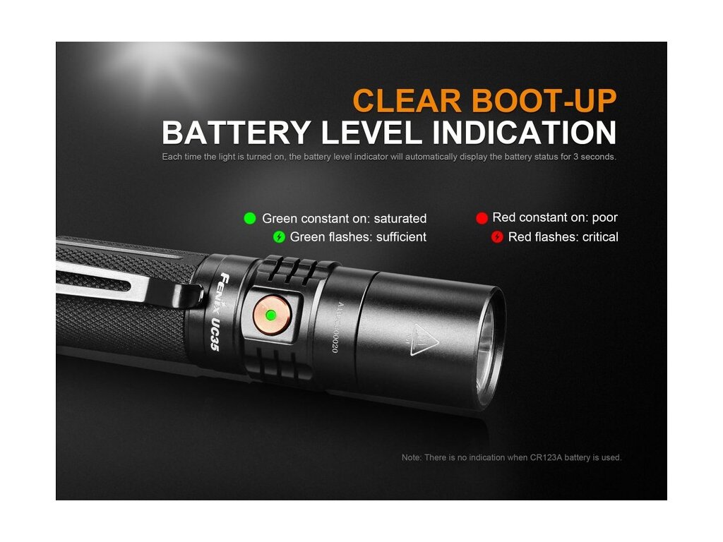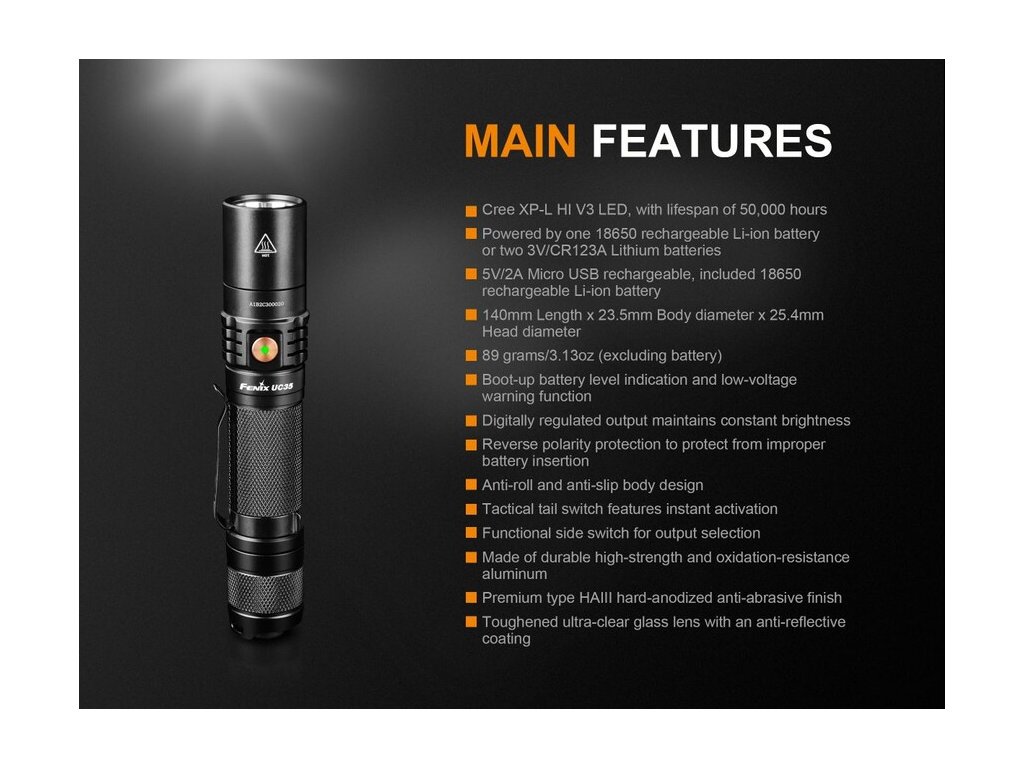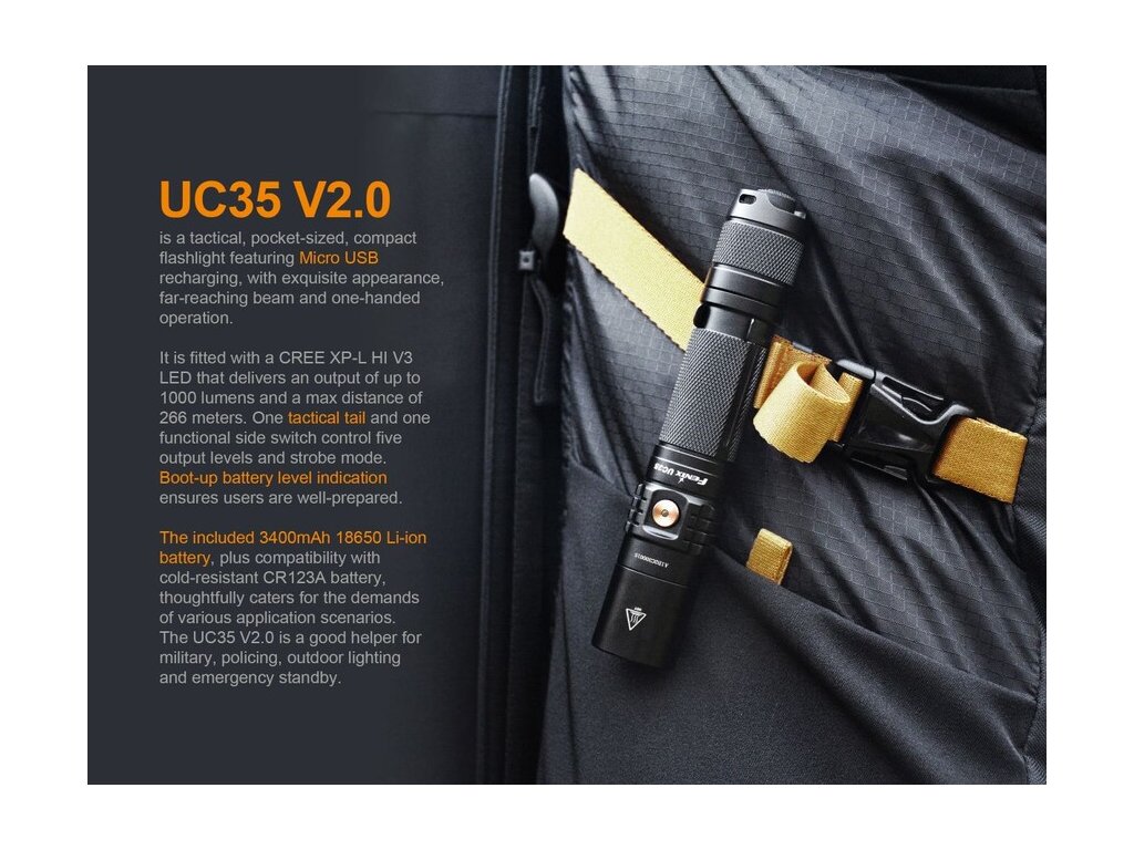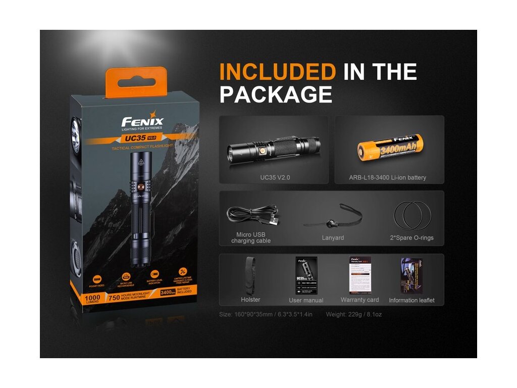 Fenix UC35 V2.0 je dodávaná s päťročnou zárukou na svietidlo a dvojročnou zárukou na akumulátor.