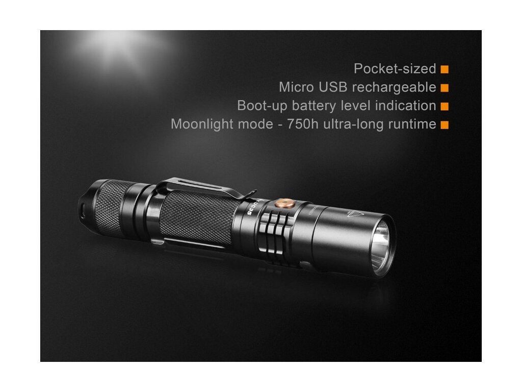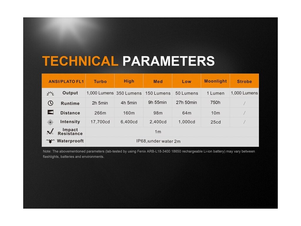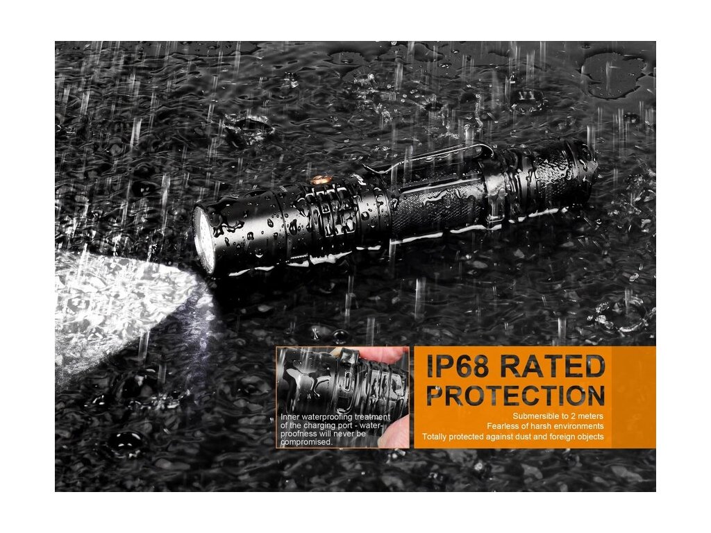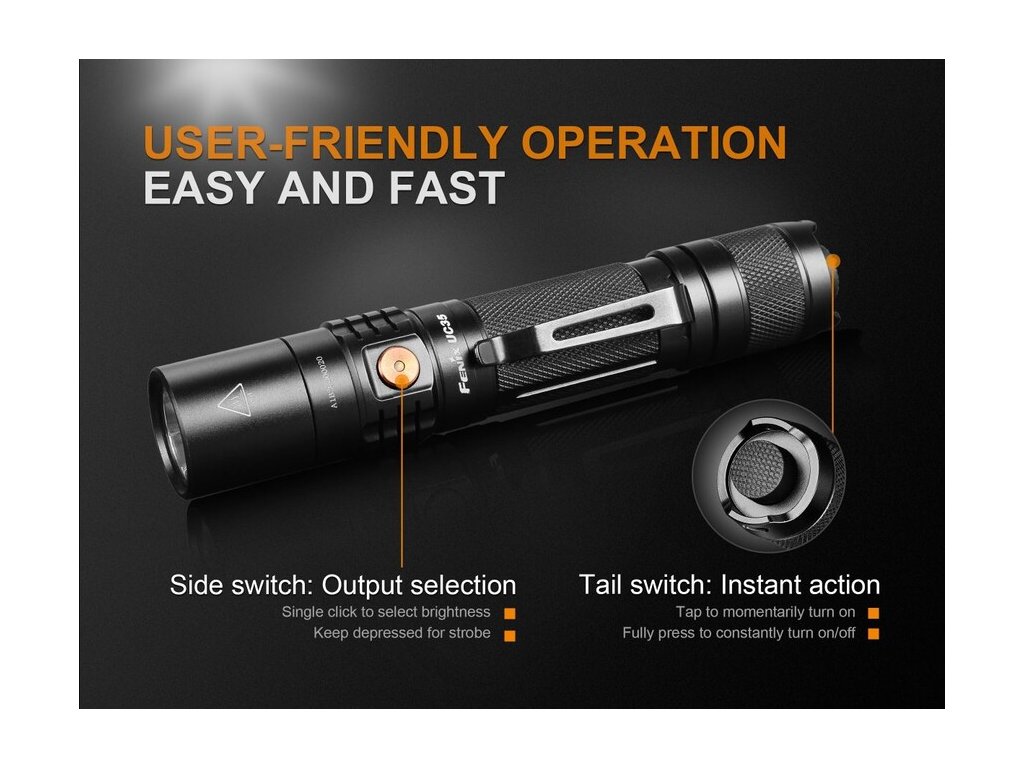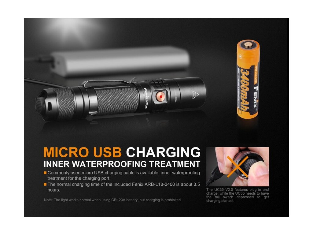 Taktická baterka Fenix UC35 V2.0 je vybavená najnovšou LED Cree XP-L HI V3, ktorá ponúka svetelný výkon až 1000 lúmenov (ANSI) a dosah svetla až 266 metrov. Súčasťou balenia je nabíjateľný Li-ion akumulátor 18650 s kapacitou 3400 mAh, ktorý je možné dobíjať priamo v baterke pomocou bočného micro-USB konektora. Baterka je navyše kompatibilná s dvomi jednorazovými batériami CR123A, čo poskytuje flexibilitu pri napájaní.