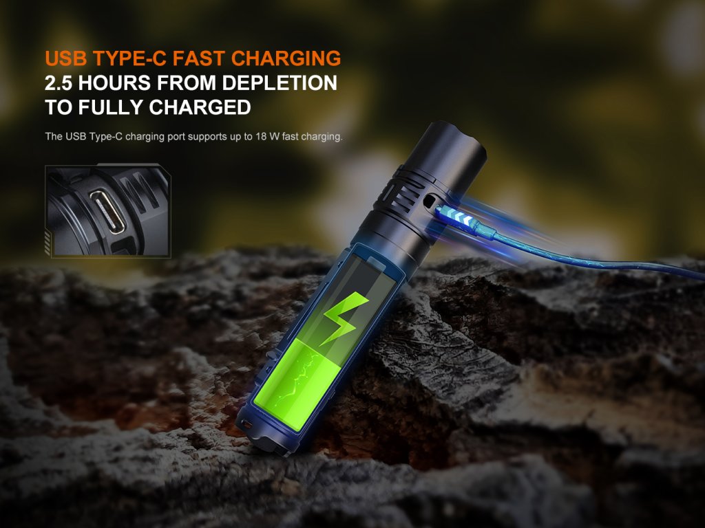Nabíjanie prebieha cez USB-C konektor na boku svietidla, pričom úplné nabitie akumulátora trvá približne 2,5 hodiny. Počas nabíjania je svietidlo schopné svietiť, avšak len v najnižšom režime 5 lúmenov.