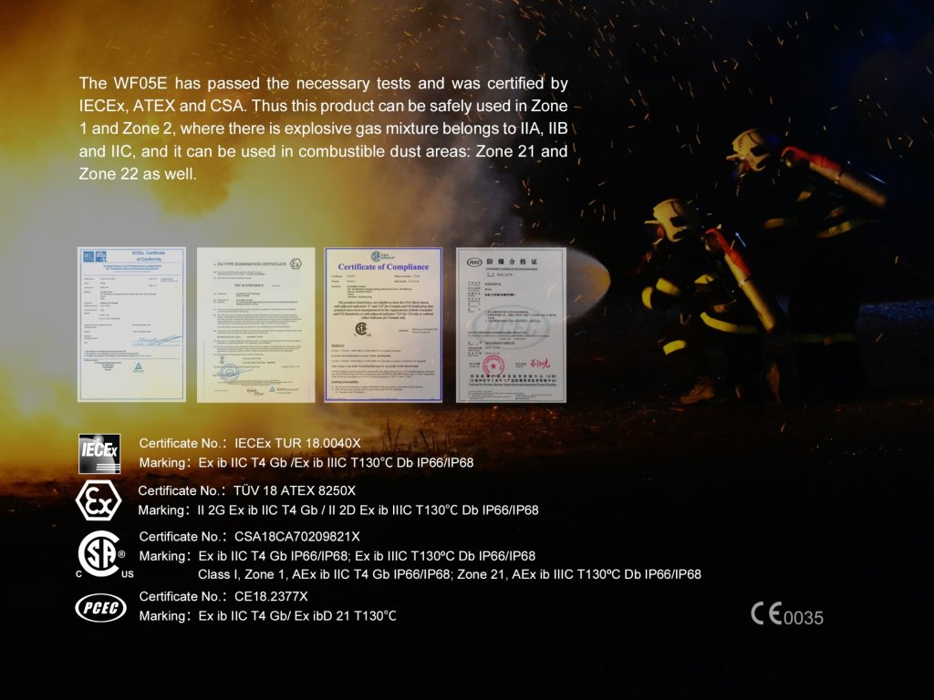 Svietidlo Fenix WF05E je certifikované na použitie v zónach 1-2 výbušných plynov a zónach 21-22 výbušného prachu: