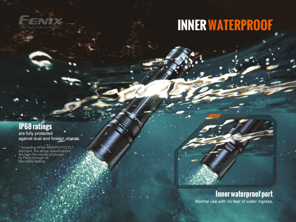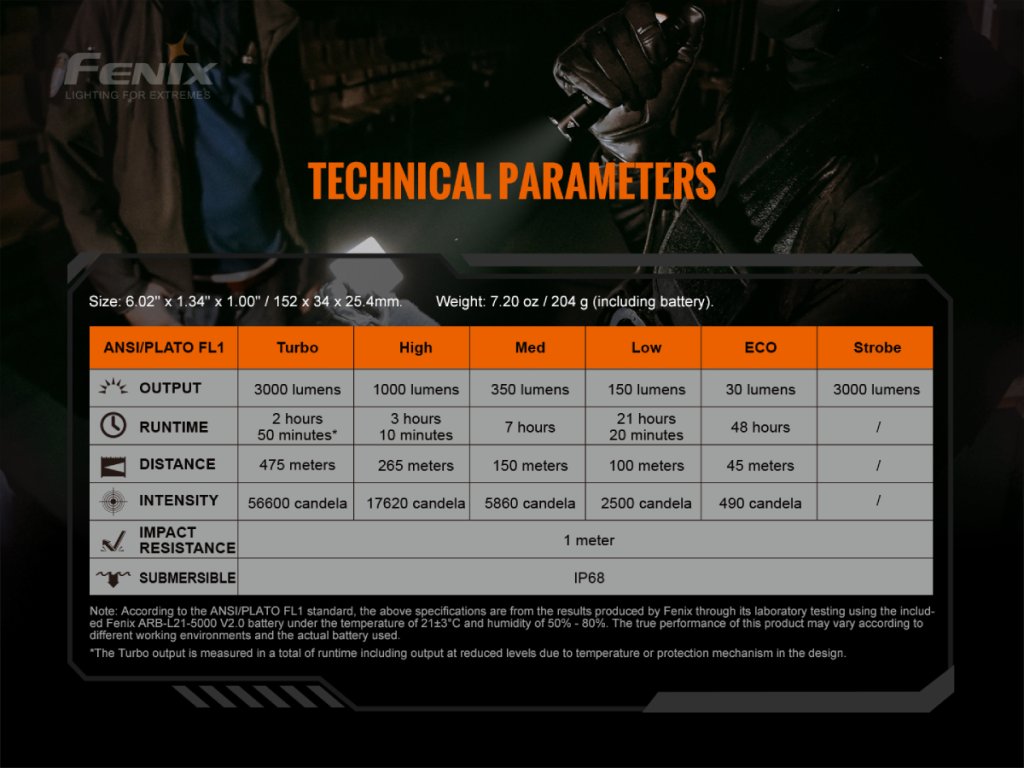 • Príslušenstvo: Šnúrka na zápästie, púzdro na opasok, náhradný o-krúžok, USB-C kábel, akumulátor Fenix Li-ion 21700 5000 mAh.
