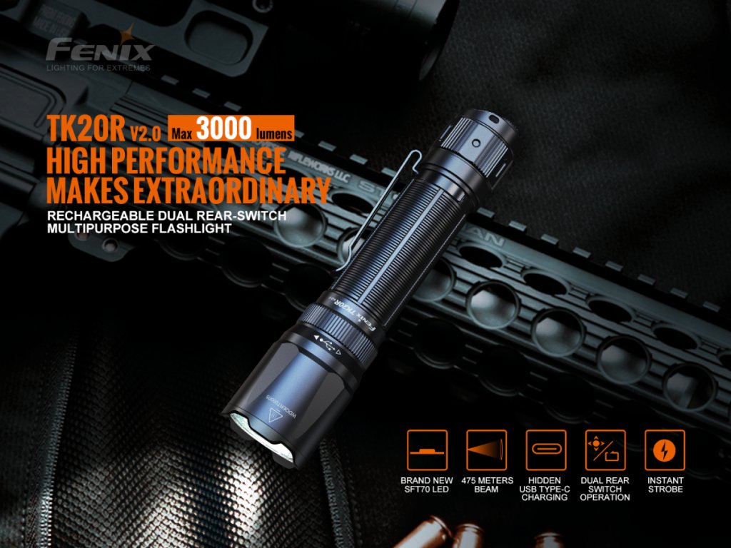 Taktické svietidlo Fenix TK20R V2.0 ponúka svetelný tok až 3000 lúmenov a dosvit 475 metrov. Je vybavené špičkovou LED Luminus SFT-70, ktorá v kombinácii s hladkým reflektorom vytvára dobre zaostrený svetelný kužeľ. Svietidlo disponuje šiestimi režimami svietenia vrátane stroboskopu a je vybavené moderným USB-C konektorom na nabíjanie. Nabíjací otvor je chránený skrutkovacou maticou, čím je zabezpečená odolnosť proti vode a nečistotám. Vďaka robustnému prevedeniu je vhodné pre profesionálov, ozbrojené zložky a poľovníctvo.