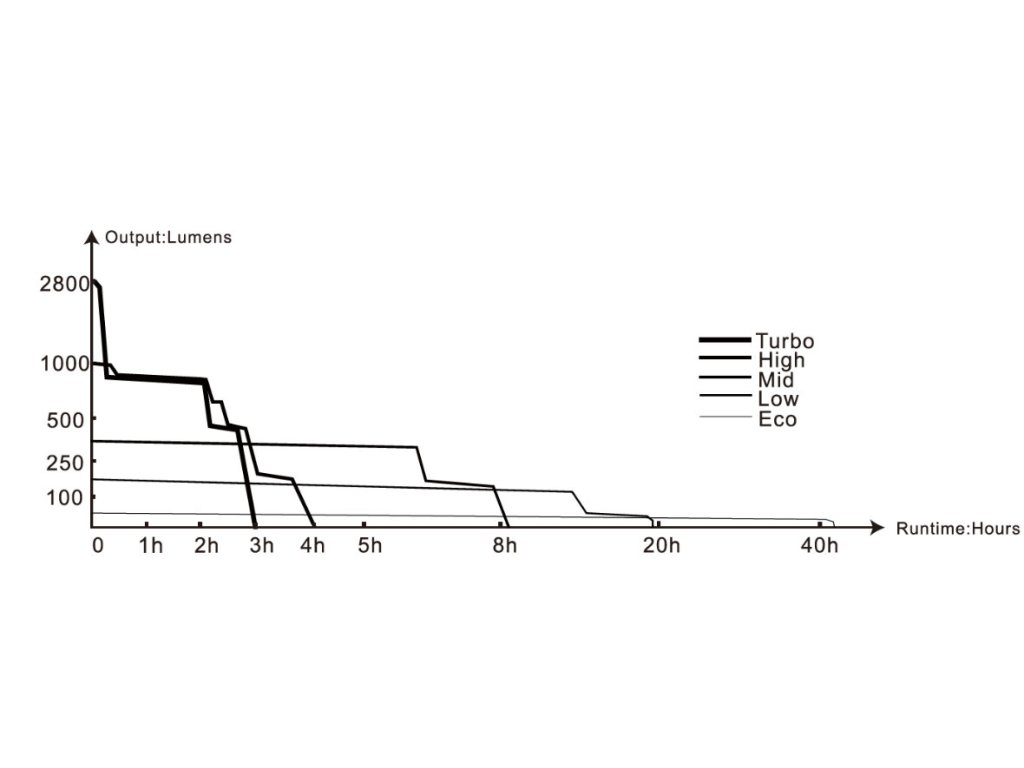 • Služobný Mód: 1000 lúmenov (4 hodiny) -> 350 lúmenov (8,1 hodiny) -> 150 lúmenov (18,5 hodiny) -> 30 lúmenov (49,5 hodiny) -> stroboskop 2500 lúmenov.