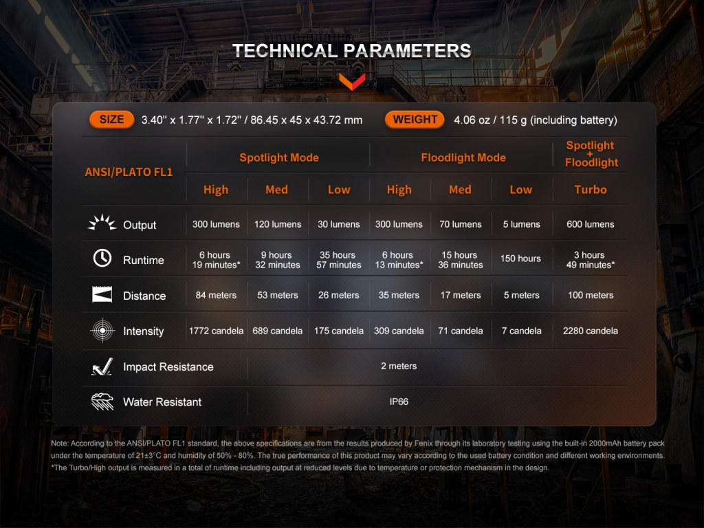 • Diaľkový reflektor: 300 lúmenov (6,3 hodiny) -> 120 lúmenov (9,5 hodiny) -> 30 lúmenov (35,9 hodiny).
