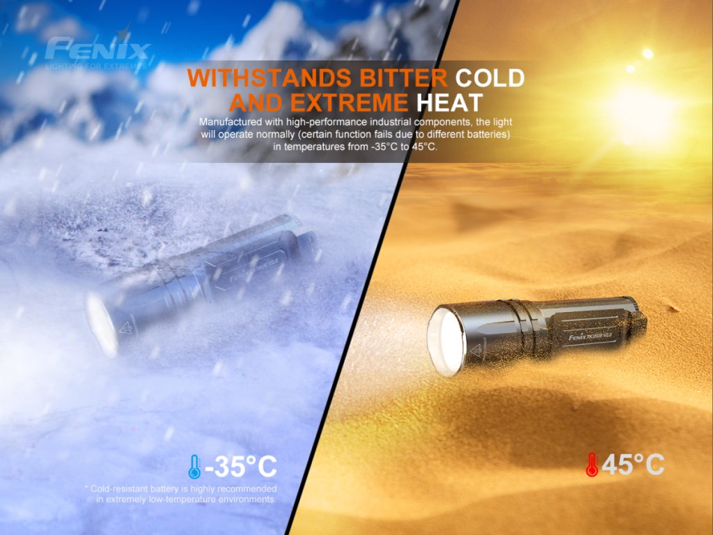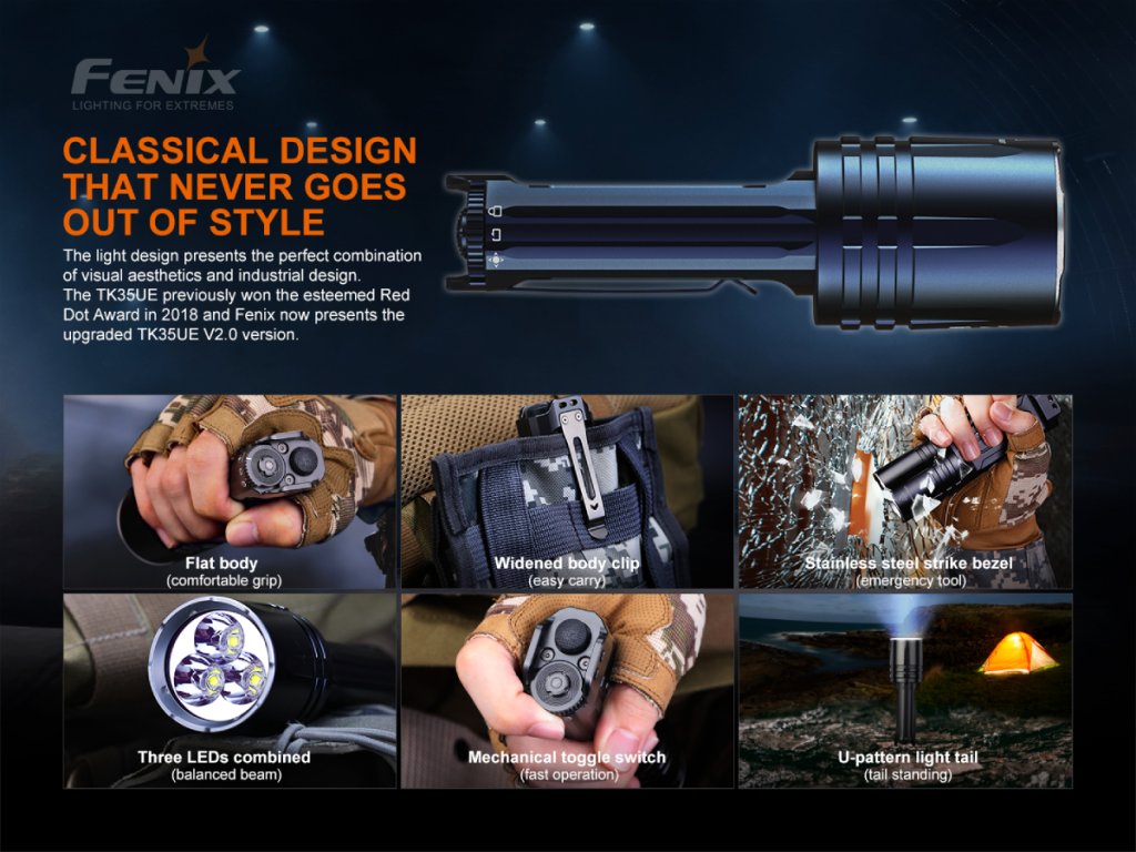 Štvrtá generácia taktického svietidla Fenix TK35 Ultimate Edition V2.0 prináša extrémny svetelný tok až 5000 lúmenov (ANSI) a široký plynulý kužeľ s dosvitom až 400 metrov. Tieto vlastnosti dosahuje vďaka trom vysoko výkonným LED Luminus SST-40. Svietidlo je odporúčané napájať dvoma Li-ion akumulátormi typu 18650 (nie sú súčasťou balenia) alebo štyrmi CR123A batériami. V núdzi možno použiť aj dve CR123A batérie alebo jeden 18650 akumulátor, s ktorými ale nebudú dostupné najvyššie režimy. Svietidlo je ideálne pre bezpečnostné zložky, lovcov a outdoorové aktivity.