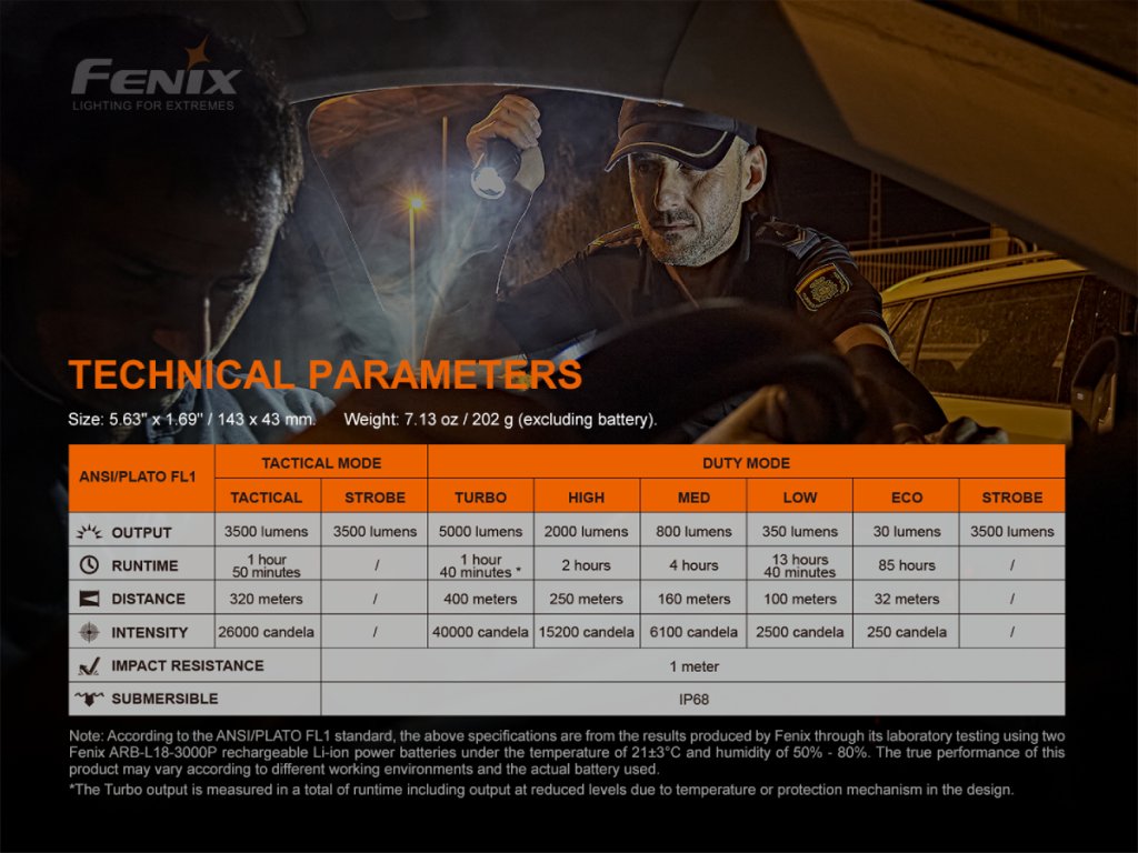 • Služobný mód: 5000 lúmenov (1,7 hodiny) -> 2000 lúmenov (2 hodiny) -> 800 lúmenov (4 hodiny) -> 350 lúmenov (13,7 hodiny) -> 30 lúmenov (85 hodín) -> stroboskop 3500 lúmenov.