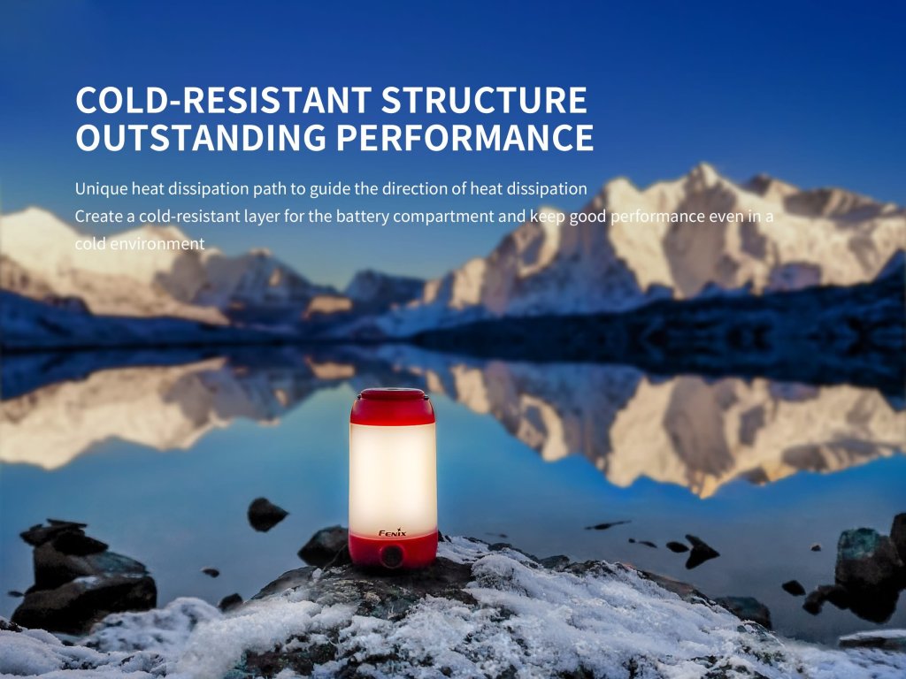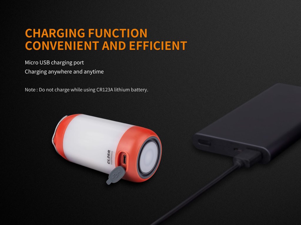 Fenix CL26R je kompaktná a praktická nabíjateľná lucerna, ktorá poskytuje svetelný tok až 400 lúmenov a výdrž až 400 hodín. Vďaka svojej všestrannosti je ideálna na osvetlenie miestnosti, stanu či pracovného stola. Napájaná je Li-ion akumulátorom typu 18650 s kapacitou 2600 mAh, ktorý sa jednoducho nabíja pomocou micro-USB konektora. V prípade núdze je možné použiť aj dve jednorazové batérie CR123A. S osvetlením v osem rôznych režimoch vrátane červeného svetla je ideálna pre kempovanie a turistiku.