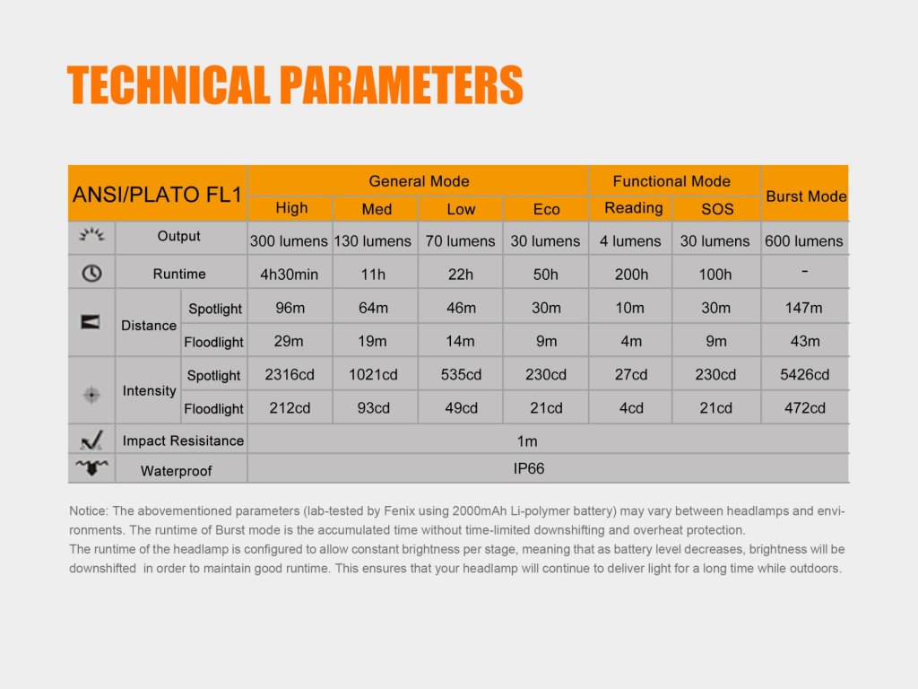 • Burst 600 lúmenov (1 minúta) -> 300 lúmenov (4,5 hodiny) -> 130 lúmenov (11 hodín) -> 70 lúmenov (22 hodín) -> 30 lúmenov (50 hodín) -> 4 lúmeny (200 hodín) -> SOS 30 lúmenov (100 hodín).