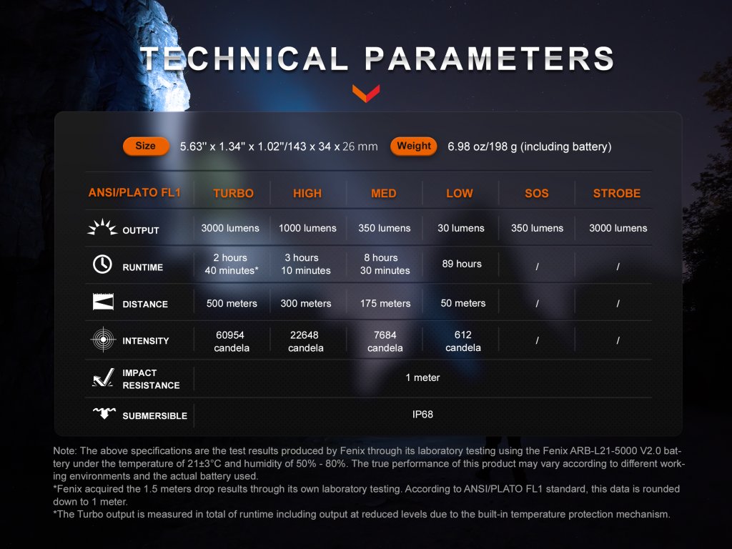 • Príslušenstvo: Šnúrka na zápästie, púzdro na opasok, akumulátor Fenix ARB-L21-5000 V2.0, USB-C kábel a náhradný o-krúžok.