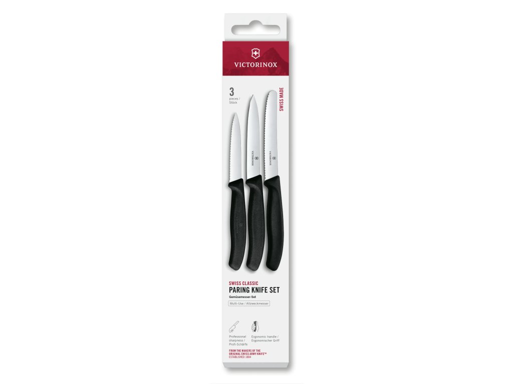 Victorinox Swiss Classic sada troch nožov čierna 6.7113.34univerzálna kuchynská sada so zúbkovaným aj rovným ostrím. Spoľahlivé nože pre každodenné krájanie, lúpanie a prípravu potravín so švajčiarskou presnosťou.