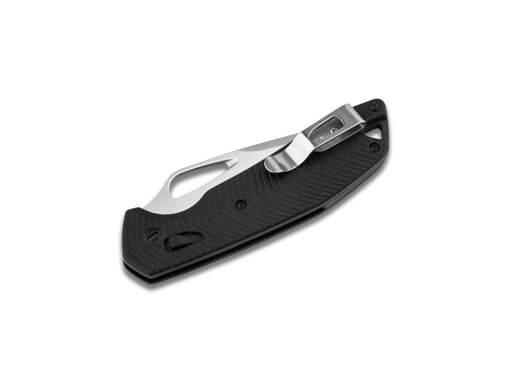 Nôž sa otvára pomocou kvapkovitého otvoru na palec, ktorý je vybavený protišmykovými zúbkami na palcovom výbežku pre bezpečnú manipuláciu. Rukoväť z nylonu vystuženého sklenými vláknami (GFN) kombinuje vysokú pevnosť s nízkou hmotnosťou, čím zaručuje skvelý úchop.