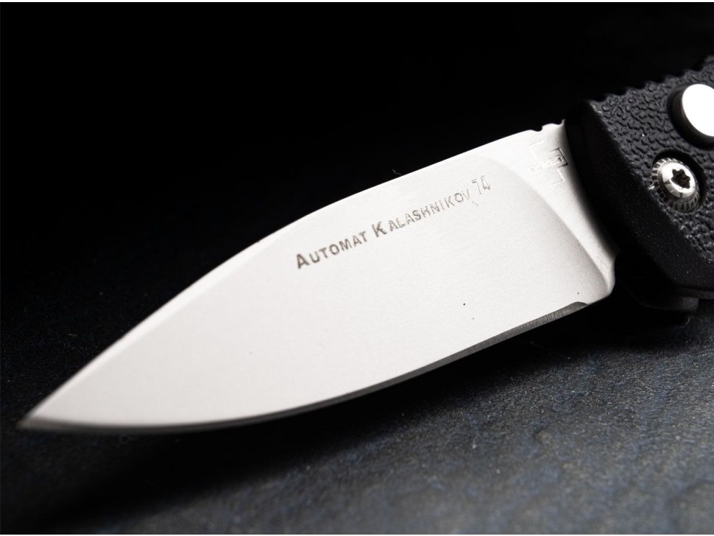 Čierna hliníková rukoväť pripomína tvar bajonetu slávnej útočnej pušky Kalashnikov. Rukoväť má vyvýšené štruktúrované drážky, ktoré zaručujú bezpečný úchop v každej situácii, čo robí tento nôž spoľahlivým pomocníkom v akýchkoľvek podmienkach.