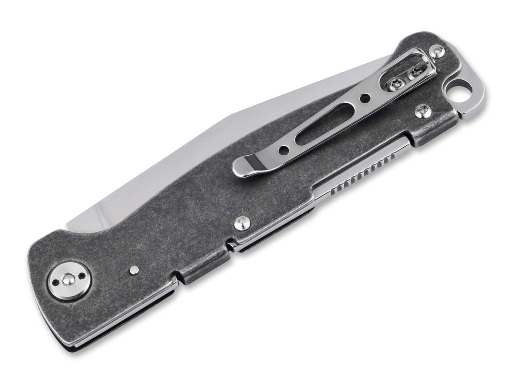 Böker Plus Atlas Backlock Clippoint je spoľahlivý vreckový nôž s minimalistickým a odolným dizajnom, ktorý sa hodí pre každodenné použitie. Rukoväť z nehrdzavejúcej ocele má povrchovú úpravu v štýle dark stonewash, čo nožu dodáva drsný, robustný vzhľad.