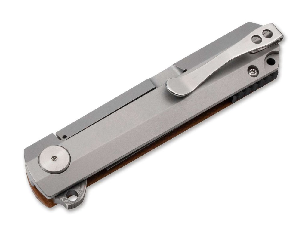 Nôž má trojrozmerne frézované črienky z Micarty v svetlohnedej farbe, ktoré zabezpečujú pohodlný úchop a elegantný vzhľad. Klip a ďalšie prvky sú vyrobené z masívneho materiálu s jemným saténovým povrchom, čo zvyšuje estetiku noža.