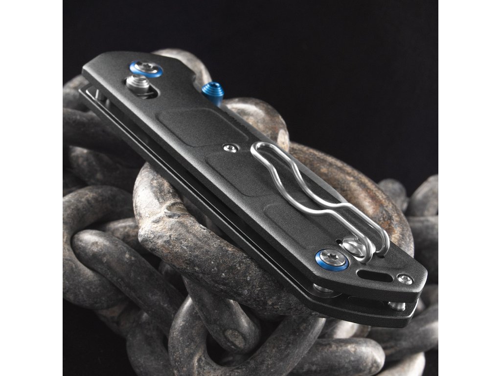 Modré eloxované prvky, Tip-Up drôtený klip (prehadzovateľný), guľaté skrutky a otvor na pútko dopĺňajú praktickú výbavu pre flexibilné nosenie.