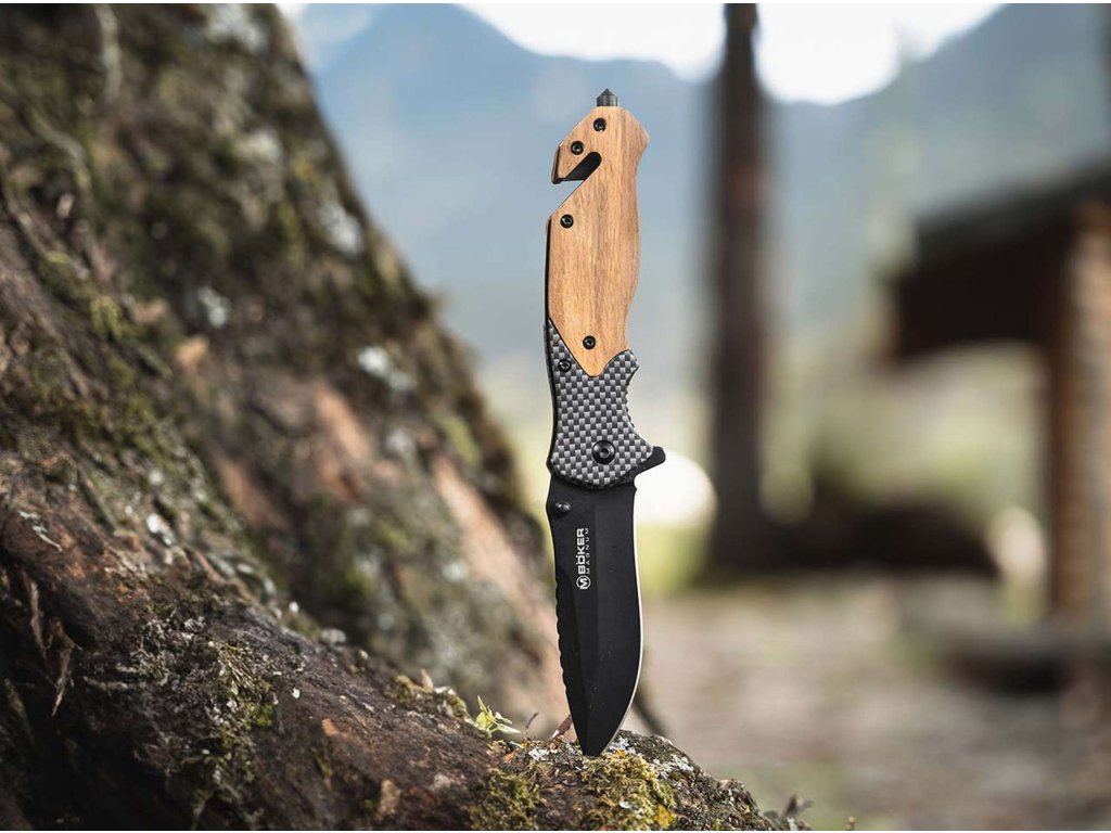 • Olivové drevo a karbonové bolstery: Rukoväť z olivového dreva ponúka príjemný, prírodný vzhľad a kontrastuje s modernými karbonovými bolstermi.