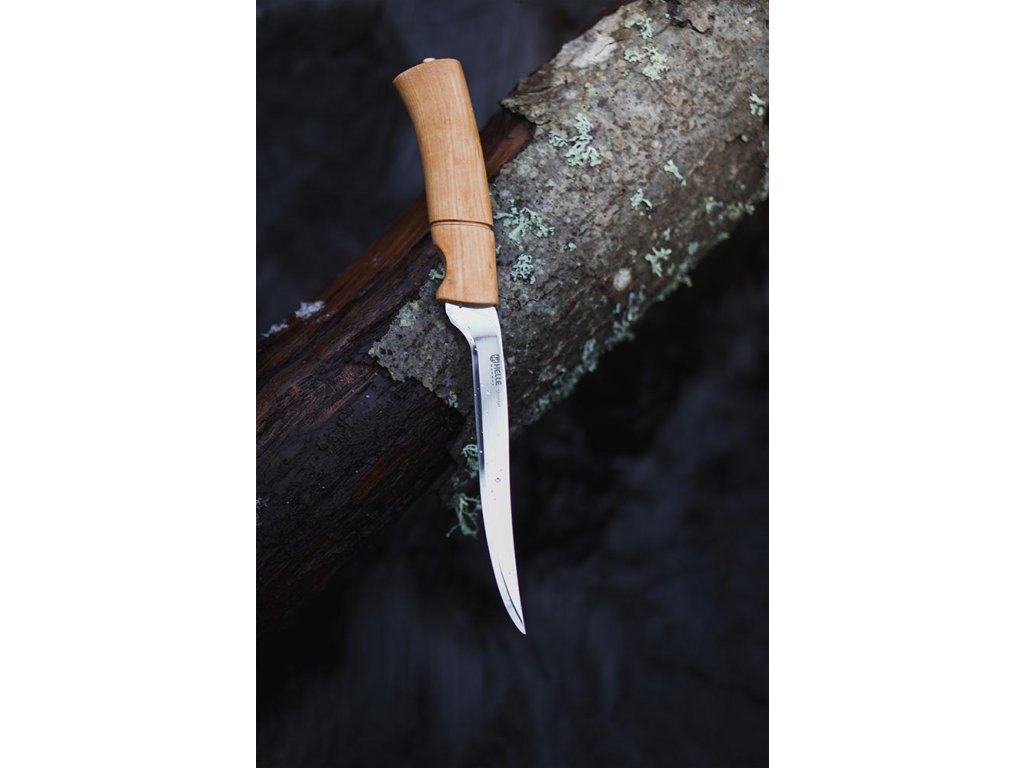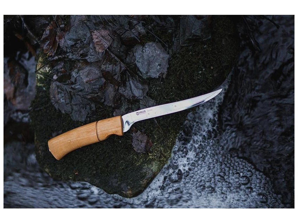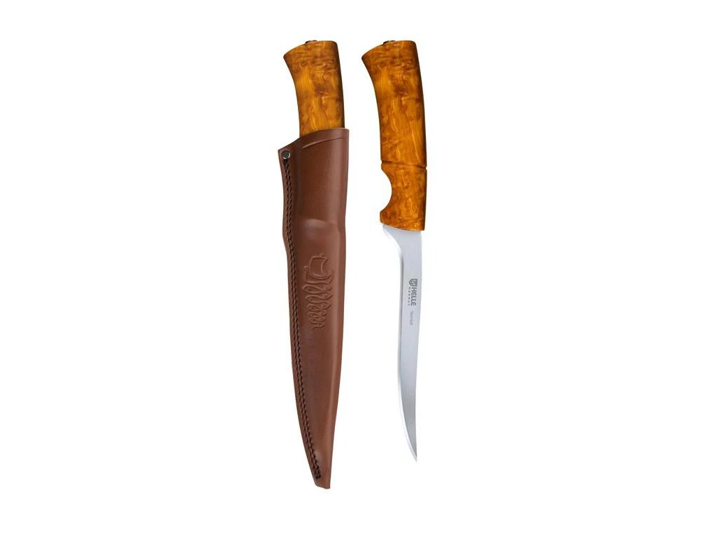 Helle Steinbit 🎣 – klasický filetovací nôž pre rybárov s tenkou čepeľou z nerezovej ocele 12C27 a rukoväťou z kučeravej brezy. Ručne vyrábaný v Nórsku už viac ako 30 rokov.