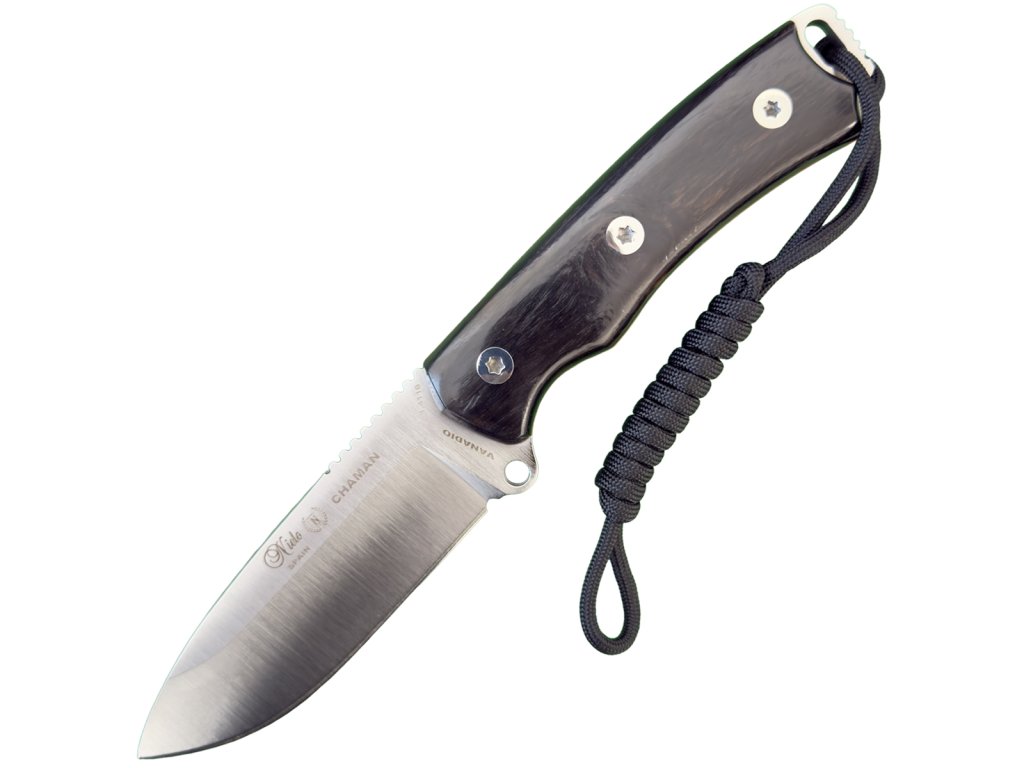 Nieto Chaman 140 G 🌲 – robustný outdoorový nôž s čepelou 11,5 cm z vanádiovej ocele 1.4116, rukoväťou z dreva Granadillo a čiernym koženým puzdrom.
