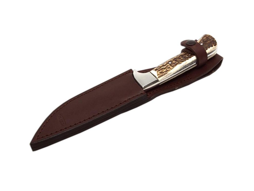 Pred parohovými střenkami sa nachádza masívne oceľové kovanie, ktoré dodáva ukazováku stabilnú oporu a zlepšuje kontrolu pri rezaní. Rukoväť z pravého jelenieho parohu dáva dýke tradičný, prirodzený a robustný charakter — každý kus je originálny.