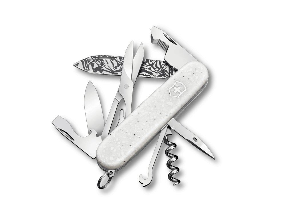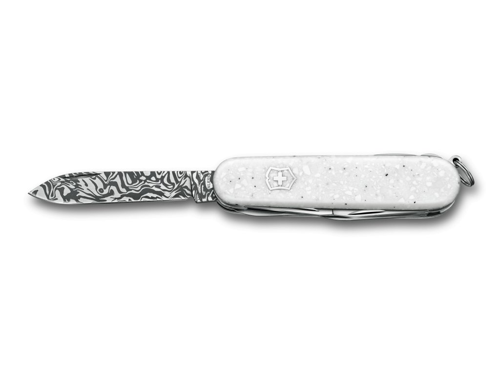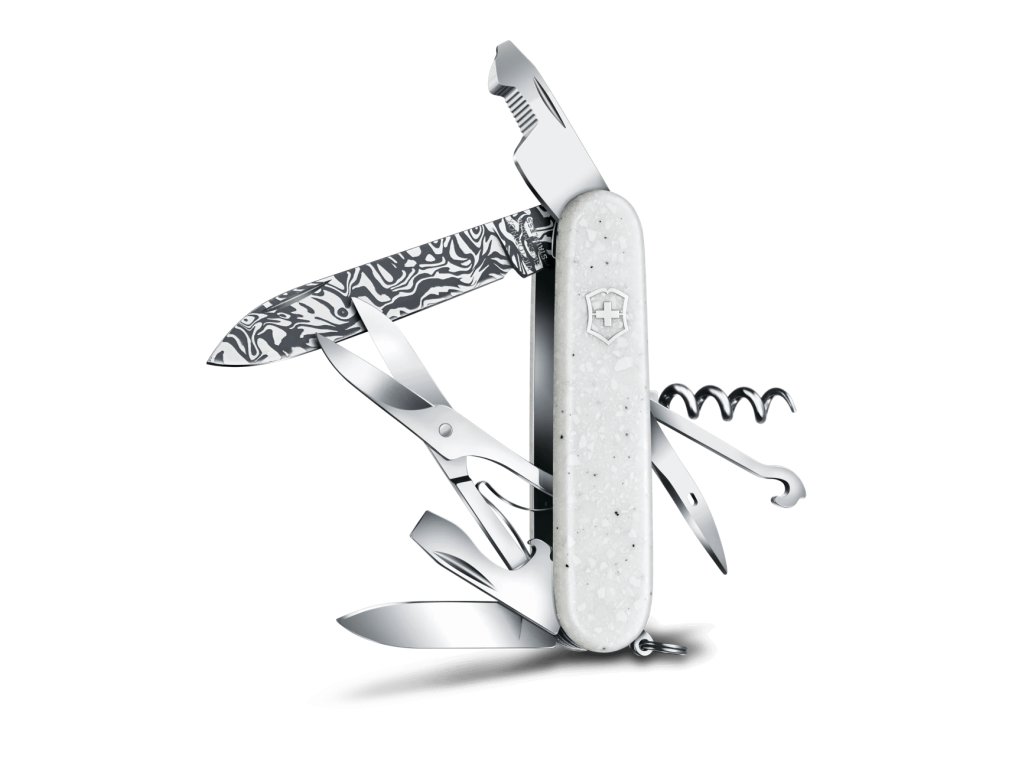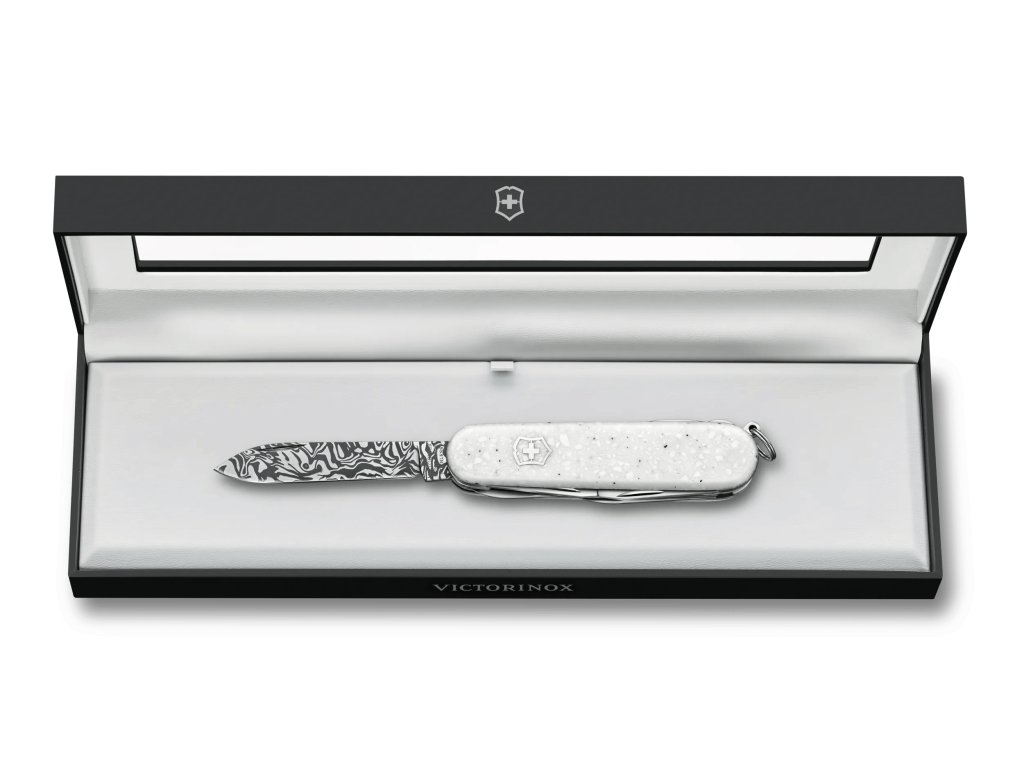 Victorinox Companion Damast Limited Edition 2025 ⚔️ – exkluzívny švajčiarsky nôž s 12 funkciami, limitovaný na 7 000 kusov s unikátnym Damasteel® Svavner™ vzorom a matnými bielymi Corian® črienkami. #5104