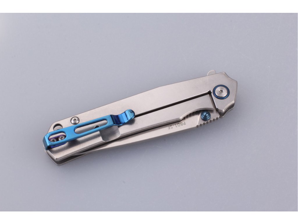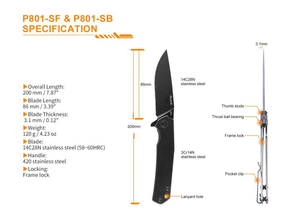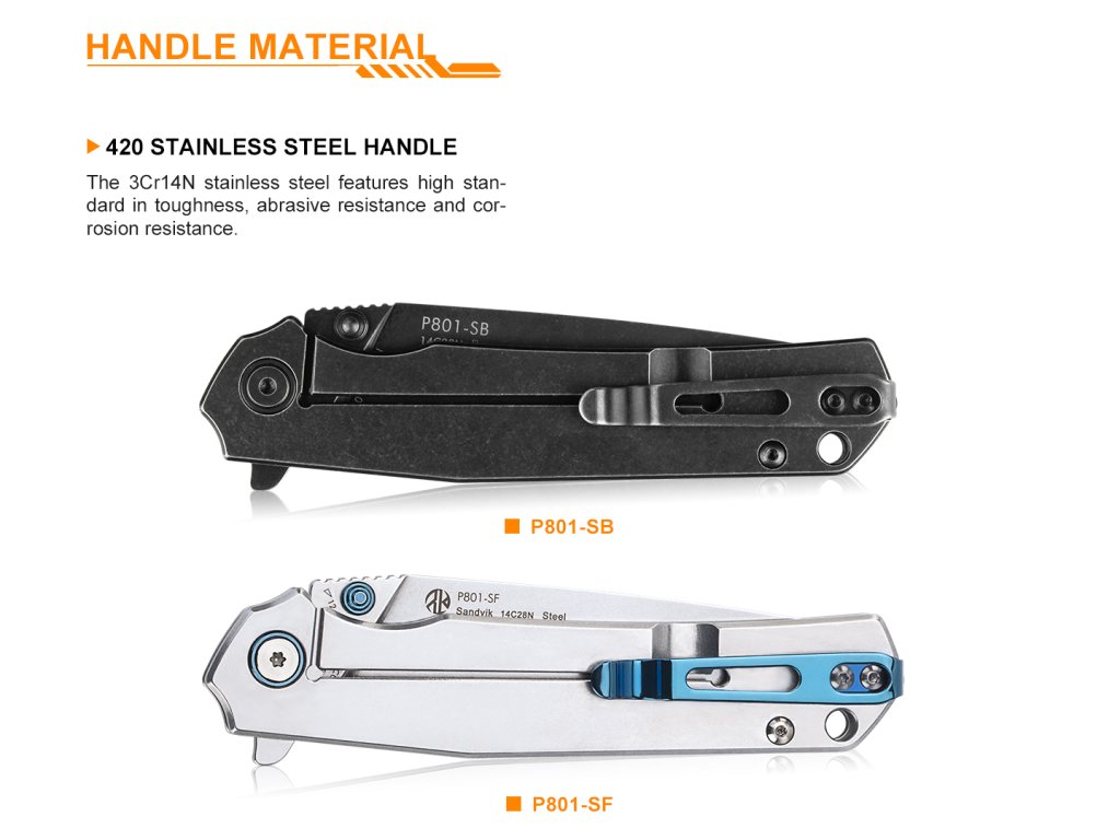 Ruike P801-SF v striebornom prevedení je štýlový a univerzálny zatvárací nôž, ideálny na každodenné nosenie (EDC). Rukoväť vyrobená z nerezovej ocele 3Cr14N s pieskovanou úpravou (stonewashed) dodáva nožu elegantný vzhľad a pevný úchop. Čepeľ z ocele Sandvik 14C28N zabezpečuje dlhotrvajúcu ostrosť a odolnosť voči korózii. Bezpečnostná poistka Frame Lock a rýchle otváranie pomocou flipperu robia z tohto noža praktický a spoľahlivý nástroj na každodenné použitie.